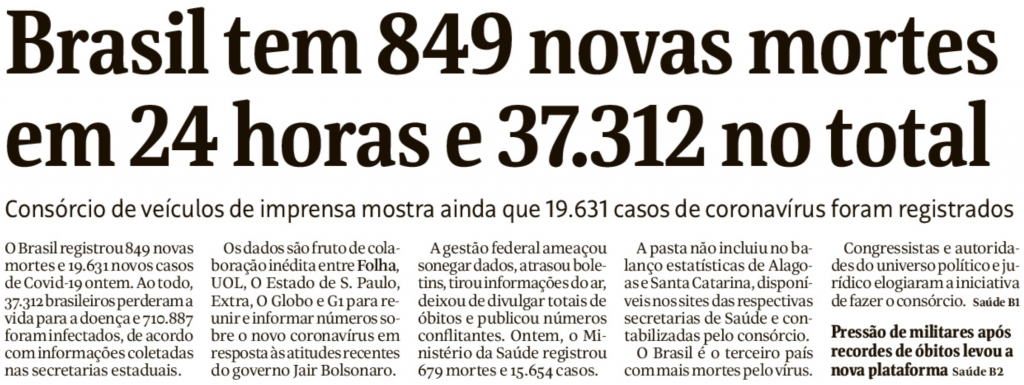 Manchete de primeira página da Folha: “Brasil tem 849 mortes em 24 horas e 37.312 no total”