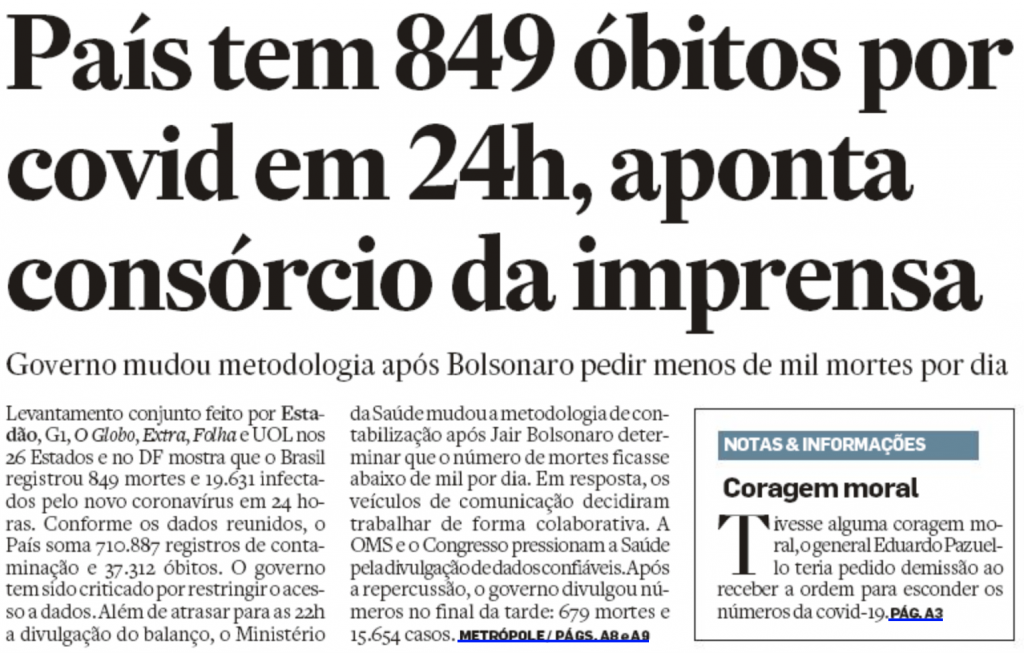 Estadão: “País tem 849 óbitos por covid em 24 horas, aponta consórcio da imprensa”