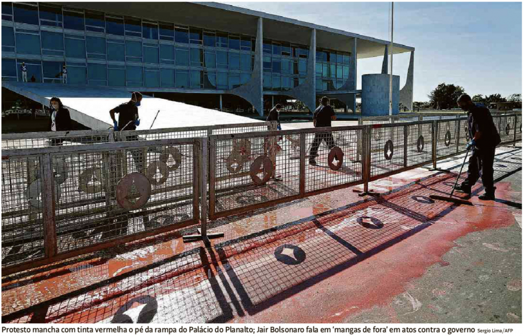 Protesto mancha de vermelho a rampa do Palácio do Planalto, na Folha.