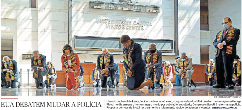 Congressistas americanos, usando cachecol com tecido africano, ajoelham em homenagem a George Floyd, assassinado por um policial branco em Minneápolis, no Estadão.