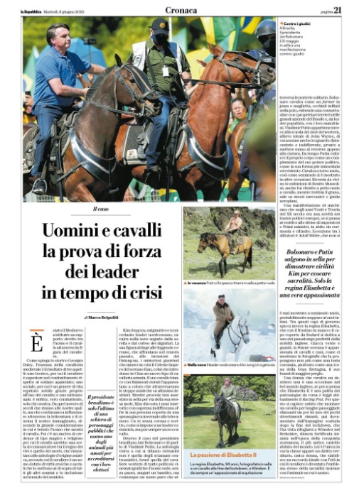 Vimos no jornal italiano La Repubblica, uma matéria de página inteira mostrando a obsessão de alguns líderes por cavalos. Bolsonaro em destaque na reportagem.