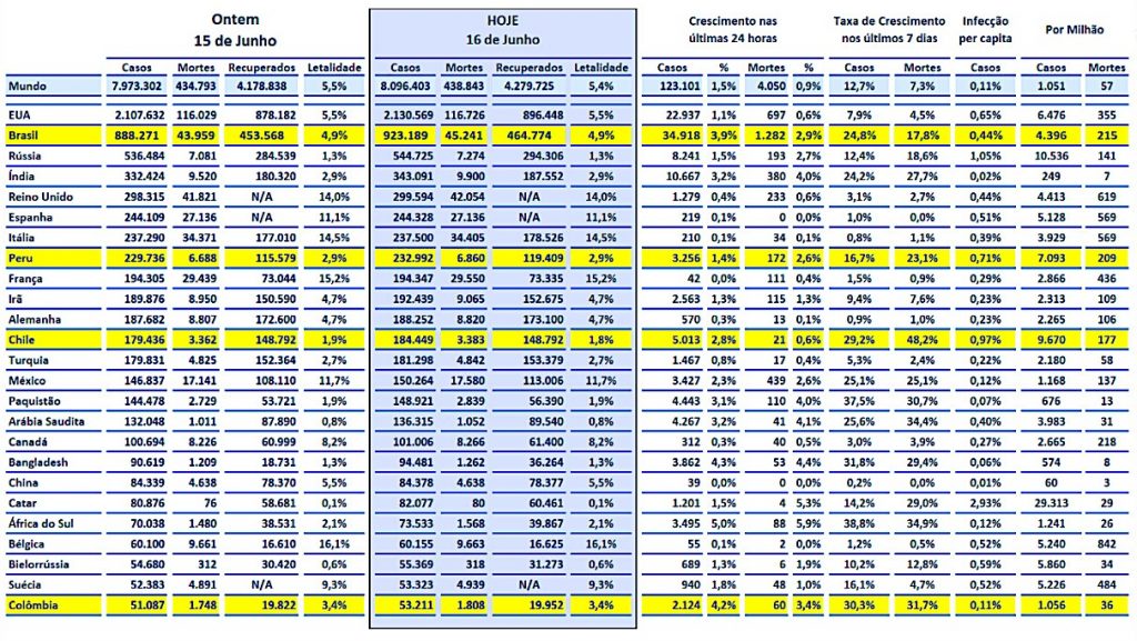 O Covid-19 no Brasil e no mundo – 16 de Junhode 2020. Visão diária dos principais indicadores da pandemia pelo mundo: