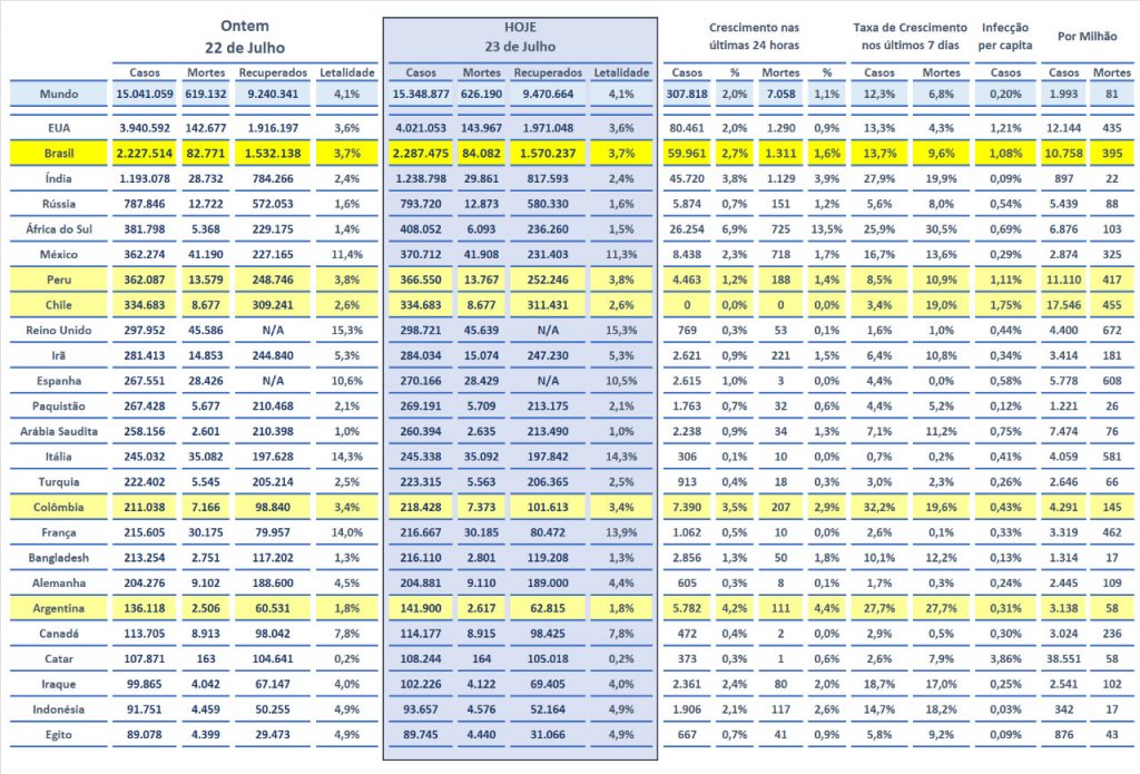 Covid-19 no Brasil e no mundo – 23 Julho 2020