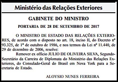 A vítima desta vez foi o vice-cônsul do Brasil em Nova York, Julio de Oliveira Silva, removido do cargo após criticar publicamente o governo de Michel Temer. Economista e no cargo há três anos – ao todo oito anos na carreira