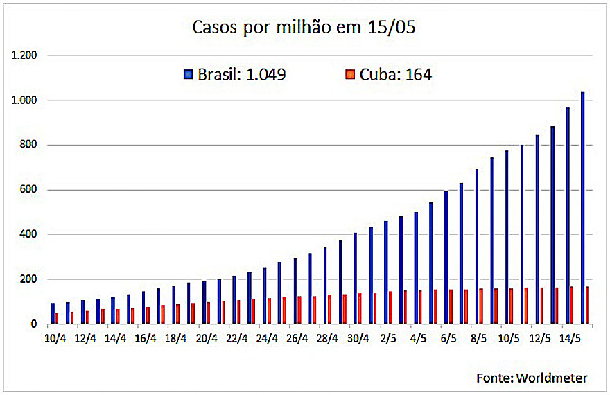 O jornal do Fria (sim, no singular, só sobrou um) dirá: esse embusteiro comunista está misturando dados para confundir os incautos, já que o Brasil tem 210 milhões de habitantes e Cuba apenas 11 milhões. Ah é? No Brasil temos 1040 contaminados por milhão de habitantes – em Cuba são 164 por milhão de habitantes. Nos óbitos os números são semelhantes: no Brasil, morreram 71 pessoas por milhão de habitantes. Em Cuba são 7 por milhão. Enquanto o Brasil testa 3.462 habitantes por milhão, Cuba testa 7.048 por milhão. Ontem, dia 15 de maio, morreram 824 brasileiros contaminados pela praga. Em Cuba não há registros de óbitos há três dias.
