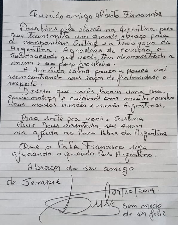 O que irritou profundamente o presidente Jair Bolsonaro, causou uma grande satisfação ao ex-presidente Luiz Inácio Lula da Silva. Numa carta manuscrita ao presidente argentino eleito domingo, Lula envia os parabéns a Alberto Fernández e a Cristina Kirchner, sua vice.
