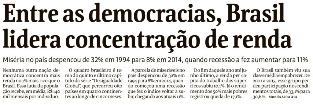 “Entre democracias, Brasil lideram concentração de renda” foi a manchete principal da Folha. O jornal diz: “A parcela de miseráveis no país despencou de 32% em 1994 para 8% em 2014, quando começou uma recessão”. O jornal fala da “renda per capita do trabalho dos supericos subiu 10,1%, enquanto o rendimento dos mais pobres registrou queda de 17,1%. O jornal não fala da interrupção da democracia plena, do fim de inúmeros programas sociais, de golpe, nada disso. A culpa é única e exclusivamente da crise.