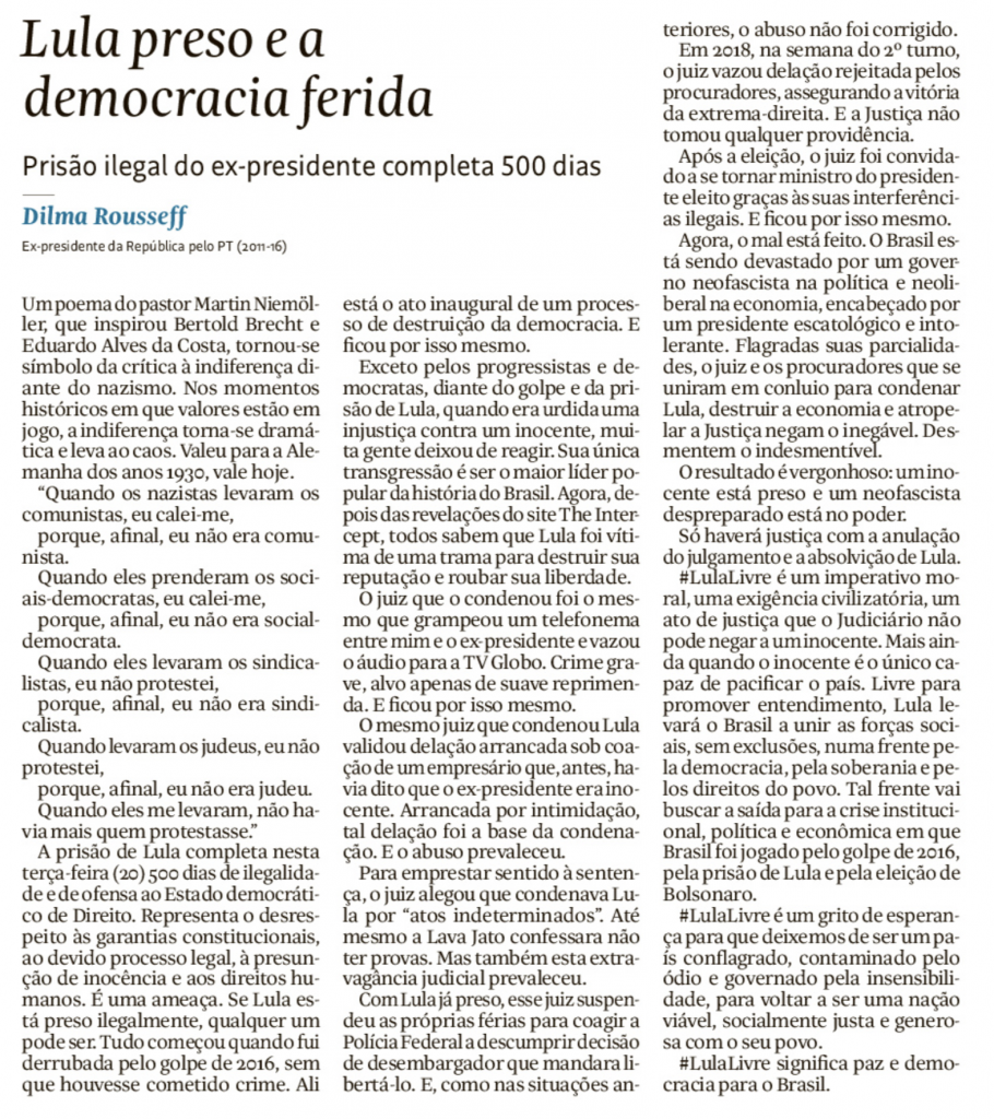 A Folha lembra os 500 dias da prisão do ex-presidente Lula com um artigo assinado por Dilma Rousseff. “O resultado é vergonhoso: um inocente está preso e um neofascista despreparado está no poder.”