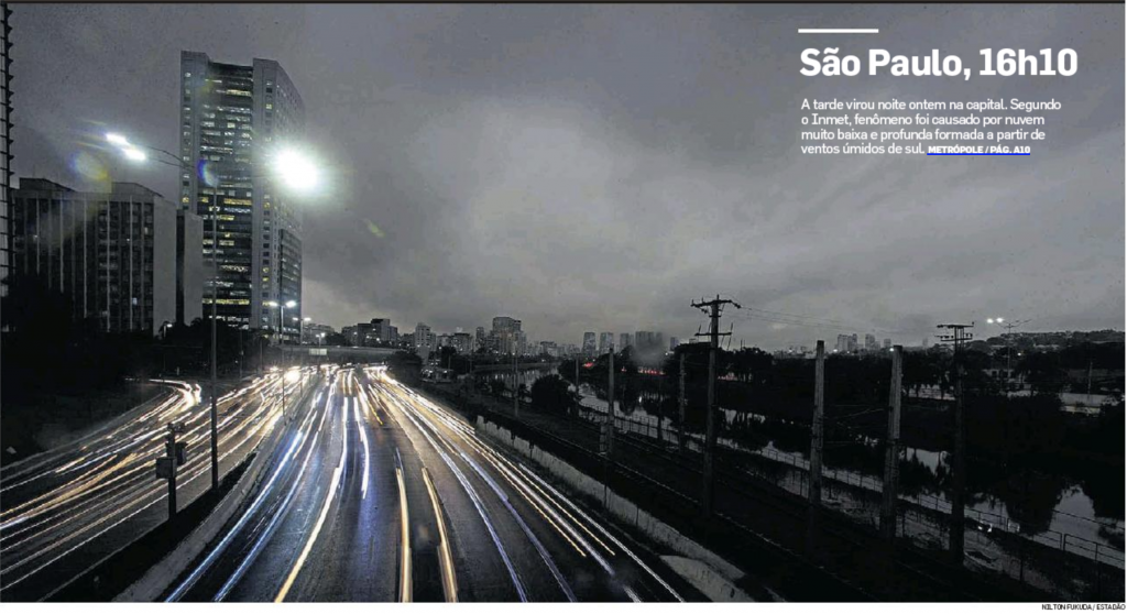 São Paulo que virou noite ontem à tarde, é destaque na primeira página do Estadão. É a Terra em transe.