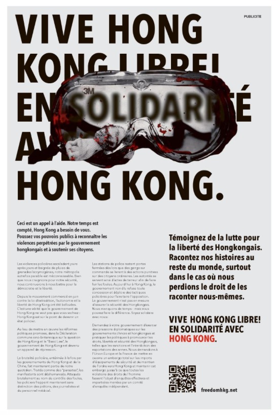 Nos jornais europeus, uma página promocional de solidariedade a Hong Kong.