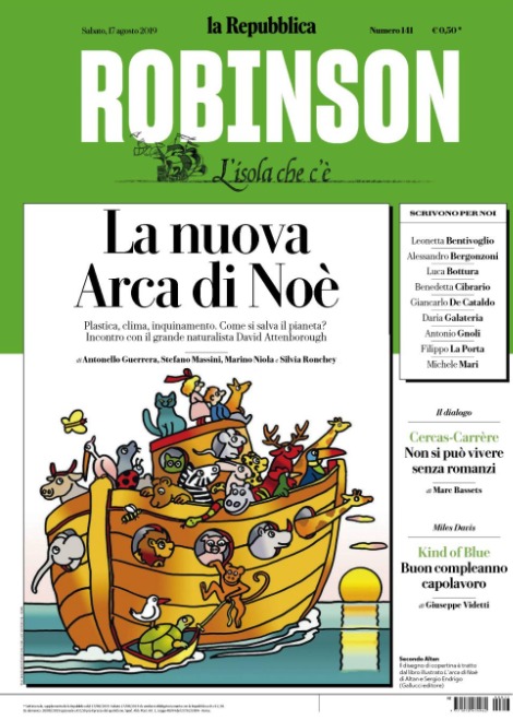 Numa curiosa capa, a Robinson, revista do jornal italiano La Repubblica, sugere ao mundo, tão maltratado e correndo risco, de construir uma nova Arca de Noé.