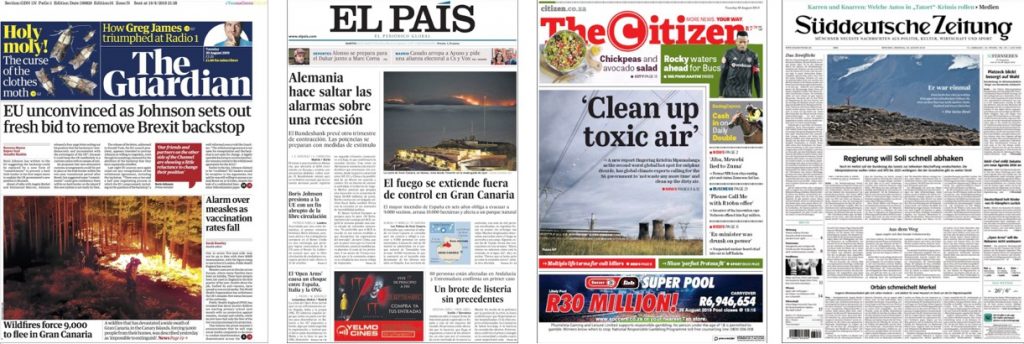 Nosso planeta judiado e correndo risco, é destaque em várias partes do mundo. Na capa do britânico The Guardian, do espanhol El País, do sul-africano The Citizen e do alemão Süddeutsche Zeitung.